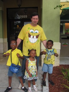 So, after investigating and liking Pollo Tropical on facebook, Brian and I got yellowed up. Brian was forced to wear his Spongebob shirt which he never intended to wear outside the house. Who are we kidding? I’m the one who wears it in the house. And, I ended up in a heat-retaining yellow jacket. Small price to pay for 5 free Chicken dinners and unexpected family fun.