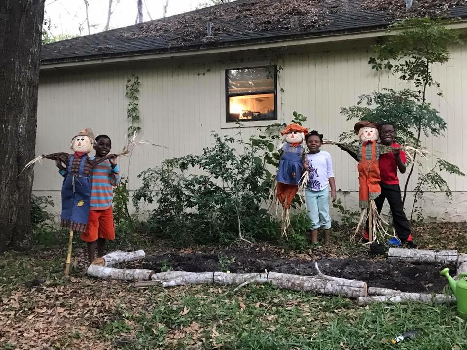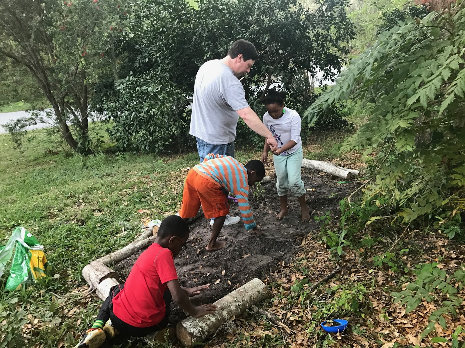 or helping to plant seeds in a garden.
