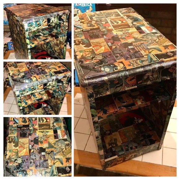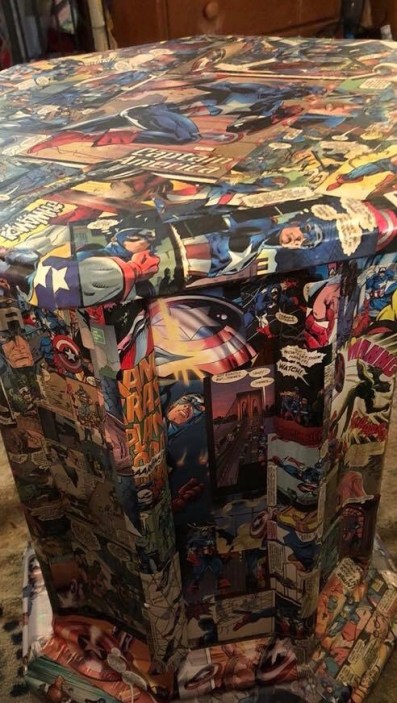 Anyway, when Brian finds a hobby, I encourage it. Either because I’m a loving wife or because I don’t want him to wake me up from my recliner nap with his complaints about being bored. 😉 It could be either one…but, mostly, the loving wife part! His latest and greatest hobby is by far, well, the greatest! Modge Podge! Not just any modge podge but nerdy modge podge! With a little modge and a bunch of comic books, he is turning our living room into a super hero/sci-fi living room. One trash can at a time.