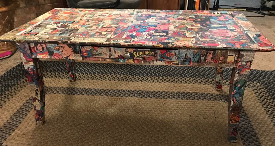 Anyway, when Brian finds a hobby, I encourage it. Either because I’m a loving wife or because I don’t want him to wake me up from my recliner nap with his complaints about being bored. 😉 It could be either one…but, mostly, the loving wife part! His latest and greatest hobby is by far, well, the greatest! Modge Podge! Not just any modge podge but nerdy modge podge! With a little modge and a bunch of comic books, he is turning our living room into a super hero/sci-fi living room. One trash can at a time.